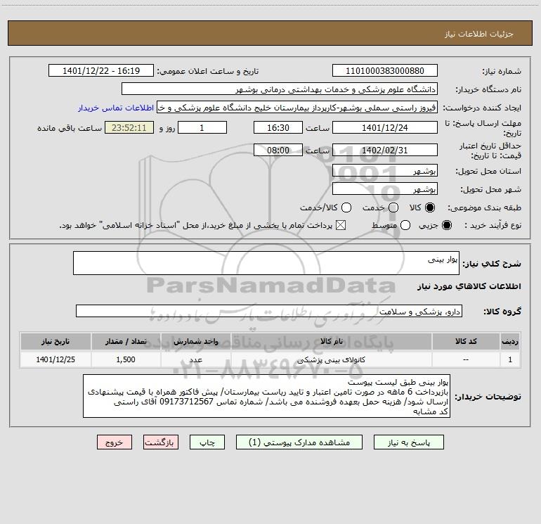 استعلام بها و موضوع استعلام استعلام پوار بینی به اطلاع کلیه شرکتها و افراد متخصص واجد شرایط میرساند، آگهی گذار در نظر دارد از طریق استعلام بها، نسبت به انتخاب و دریافت پیشنهادات اقدام نماید. این استعلام با کد آگهی ثبت شده در سامانه خبرگزاری پارس نماد : 5627452 منتشر شده است. مشخصات استعلام : تاریخ شروع استعلام: 1401/12/22 آخرین مهلت ارسال پیشنهاد قیمت : 1401/12/24 و محل اجرای پروژه : استان بوشهر میباشد. استعلام قیمت مورد درخواست : استعلام پوار بینی با دستهبندیهای تخصصی و گروه های مرتبط : خدمات و تجهیزات آزمایشگاهی و پزشکی, استعلام اطلاع رسانی میگردد.