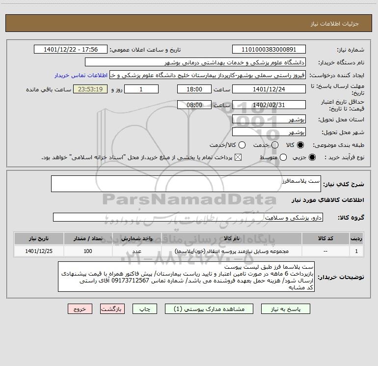 | 1 | -- | مجموعه وسایل نیازمند پروسه انتقال (خون/پلاسما) | عدد | 100 | 1401/12/25 |