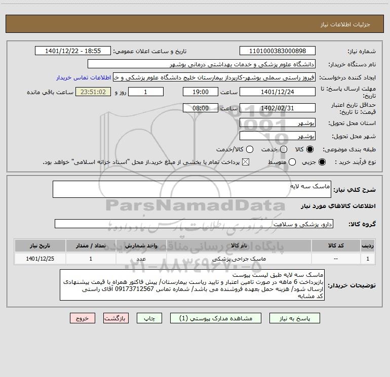 استعلام بها و موضوع استعلام استعلام ماسک سه لایه به اطلاع کلیه شرکت‌ها و افراد متخصص واجد شرایط می‌رساند، آگهی گذار در نظر دارد از طریق استعلام بها، نسبت به انتخاب و دریافت پیشنهادات اقدام نماید. این استعلام با کد آگهی ثبت شده در سامانه خبرگزاری پارس نماد : 5628023 منتشر شده است. مشخصات استعلام : تاریخ شروع استعلام: 1401/12/22 آخرین مهلت ارسال پیشنهاد قیمت : 1401/12/24 و محل اجرای پروژه : استان بوشهر میباشد. استعلام قیمت مورد درخواست : استعلام ماسک سه لایه با دسته‌بندی‌های تخصصی و گروه های مرتبط : خدمات و تجهیزات آزمایشگاهی و پزشکی, استعلام اطلاع رسانی میگردد.