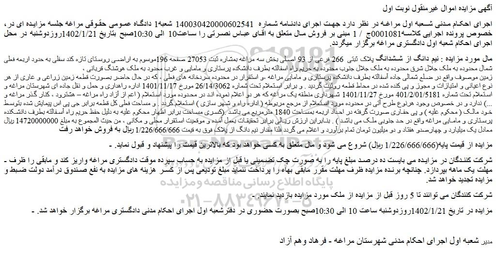 مال مورد مزایده : نیم دانگ از ششدانگ پلاک ثبتی 266 فرعی از 93 اصلی بخش سه مراغه بمشاره ثبت 27053 صفحه 196موسوم به اراضی روستای تازه کند سفلی به حدود اربعه فعلی شمال محدوده به ملک جلال شرق محدوده به ملک جلال جنوب محدوده به حریم راه اسفالته بطرف دانشکده پرستاری و مامایی و غرب محدود به ملک هوشنگ قربانی ،