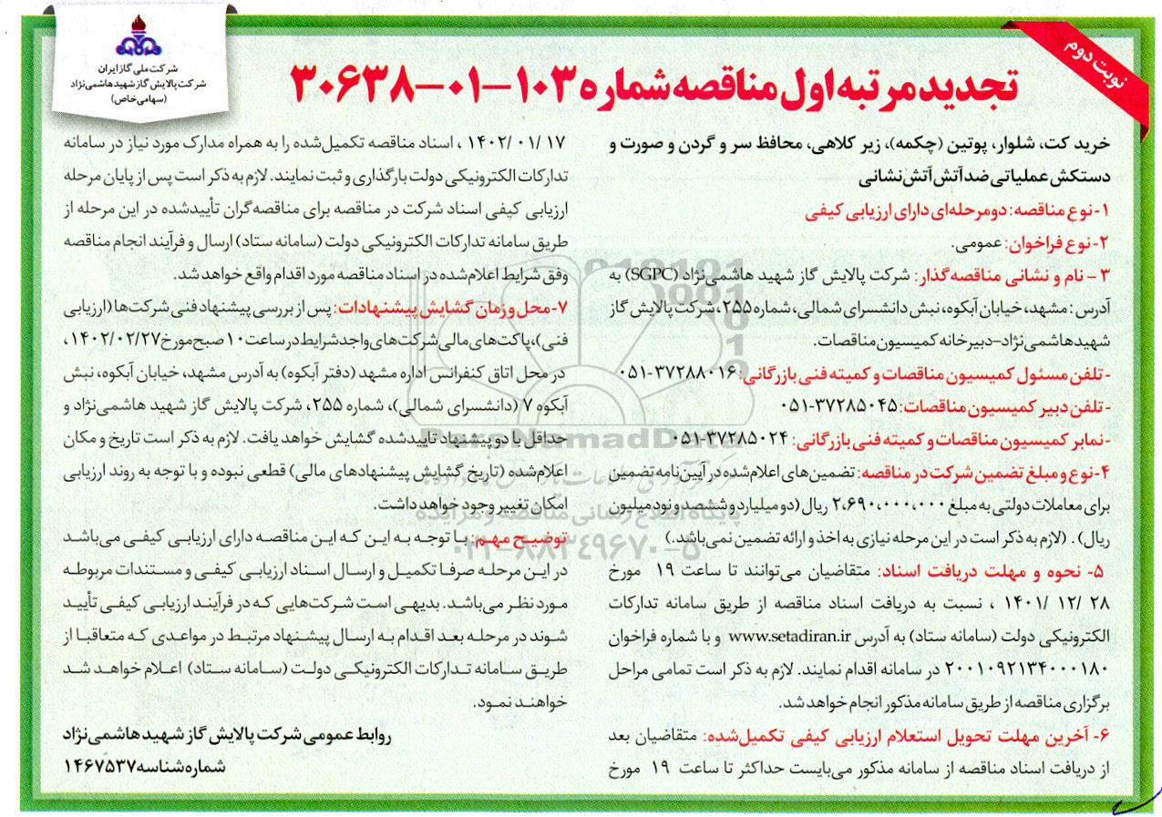 تجدید مناقصه خرید کت، شلوار، پوتین (چکمه)، زیرکلاهی، محافظ سر و گردن و صورت ...- نوبت دوم , تجدید مناقصه خرید کت، شلوار، پوتین (چکمه)، زیرکلاهی، محافظ سر و گردن و صورت ...- نوبت دوم