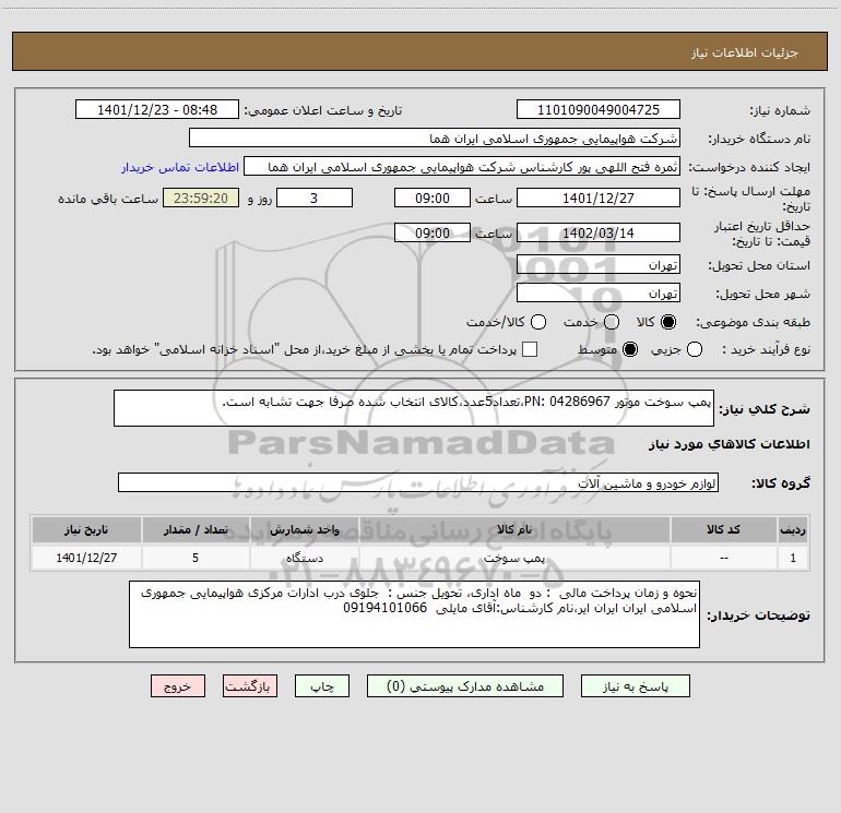 شرح کلی نیاز: پمپ سوخت موتور PN: 04286967،تعداد5عدد،کالای انتخاب شده صرفا جهت تشابه است.