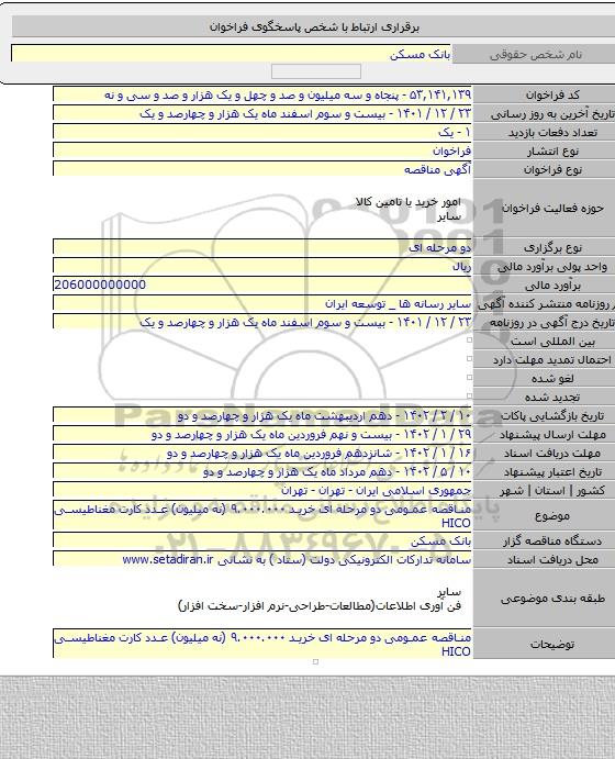 مناقصه عمومی دو مرحله ای خرید ۹.۰۰۰.۰۰۰ (نه میلیون) عدد کارت مغناطیسی HICO