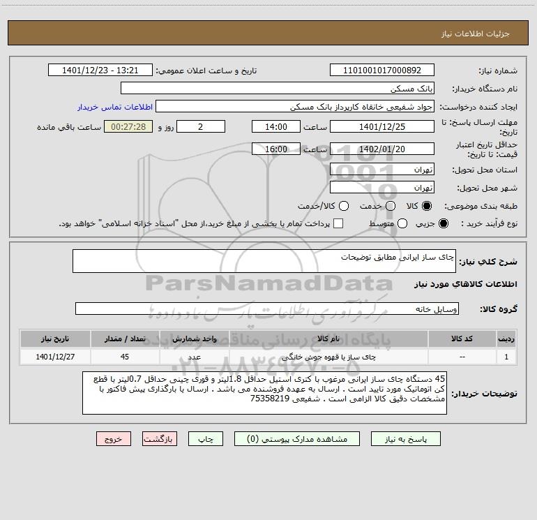 شرح کلی نیاز: چای ساز ایرانی مطابق توضیحات