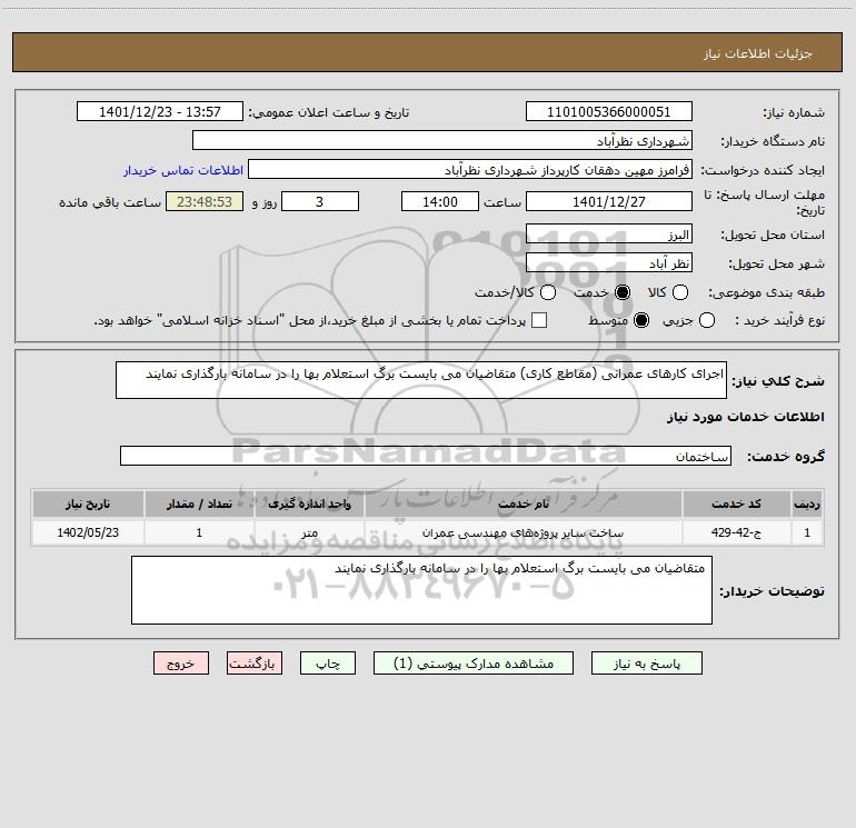 شرح کلی نیاز: اجرای کارهای عمرانی (مقاطع کاری) متقاضیان می بایست برگ استعلام بها را در سامانه بارگذاری نمایند