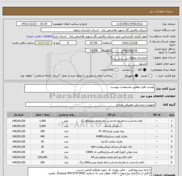| 1 | -- | کاغذ یادداشت یا دفترچه یادداشت |نام تجاری پاپکو|80 برگ | عدد | 1,000 | 1402/01/20 |
