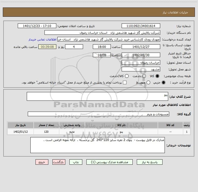 نام دستگاه خریدار:شرکت پالایش گاز شهید هاشمی نژاد استان خراسان رضوی