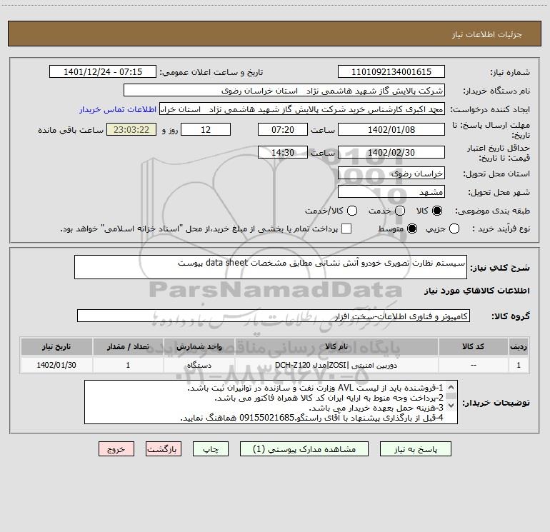 شرح کلی نیاز: سیستم نظارت تصویری خودرو آتش نشانی مطابق مشخصات data sheet پیوست