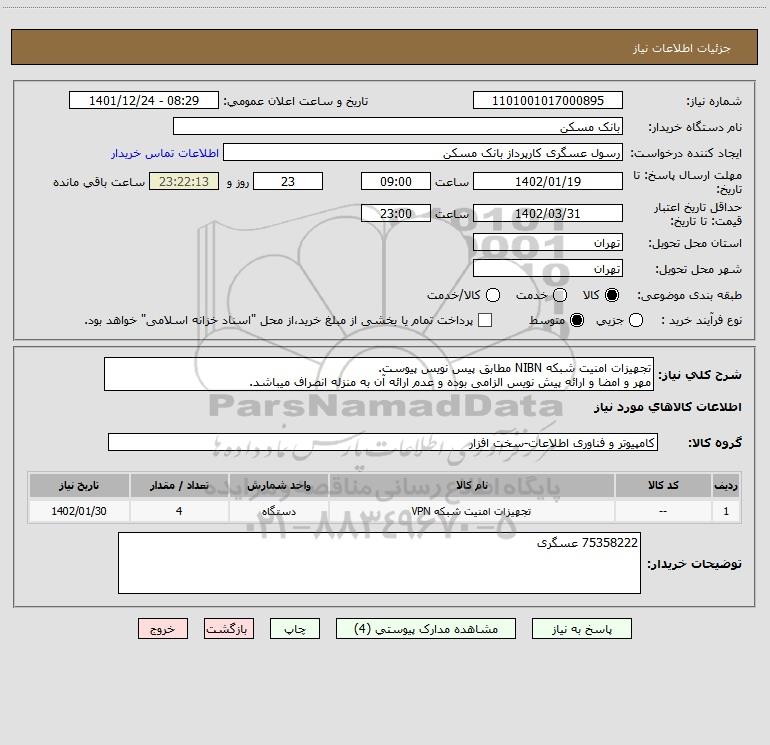 شرح کلی نیاز: تجهیزات امنیت شبکه NIBN مطابق پیس نویس پیوست. مهر و امضا و ارائه پیش نویس الزامی بوده و عدم ارائه آن به منزله انصراف میباشد.