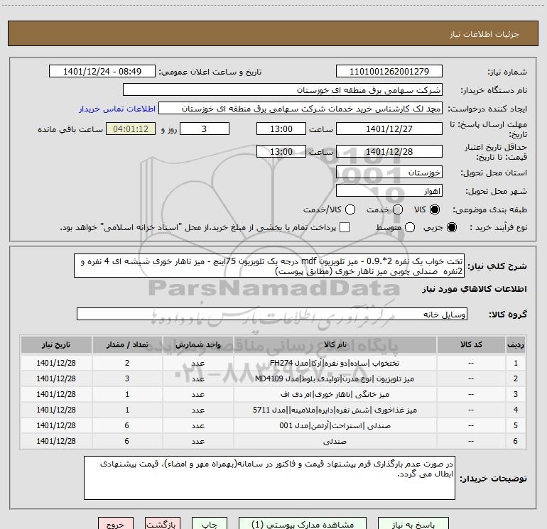 استعلام تخت خواب یک نفره 2*.0.9 - میز تلویزیون mdf درجه یک تلویزیون 75اینچ - میز ناهار خوری شیشه ای 4 نفره و 2نفره صندلی چوبی میز ناهار خوری (مطابق پیوست), استعلام تخت خواب یک نفره 2*.0.9 - میز تلویزیون mdf درجه یک تلویزیون 75اینچ - میز ناهار خوری شیشه ای 4 نفره و 2نفره صندلی چوبی میز ناهار خوری (مطابق پیوست)