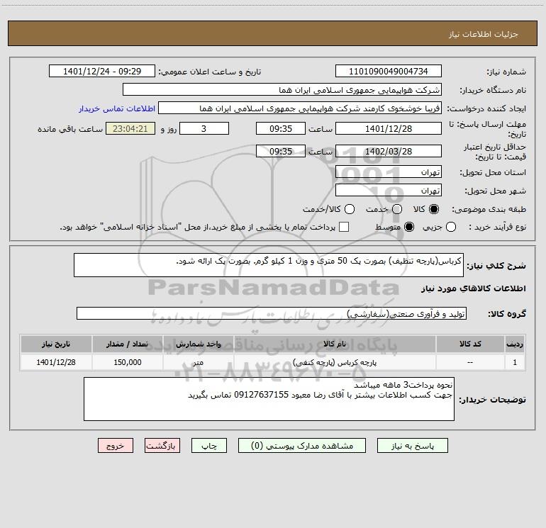 استعلام کرباس(پارچه تنظیف) بصورت پک 50 متری و وزن 1 کیلو گرم. بصورت پک ارائه شود., استعلام کرباس(پارچه تنظیف) بصورت پک 50 متری و وزن 1 کیلو گرم. بصورت پک ارائه شود.