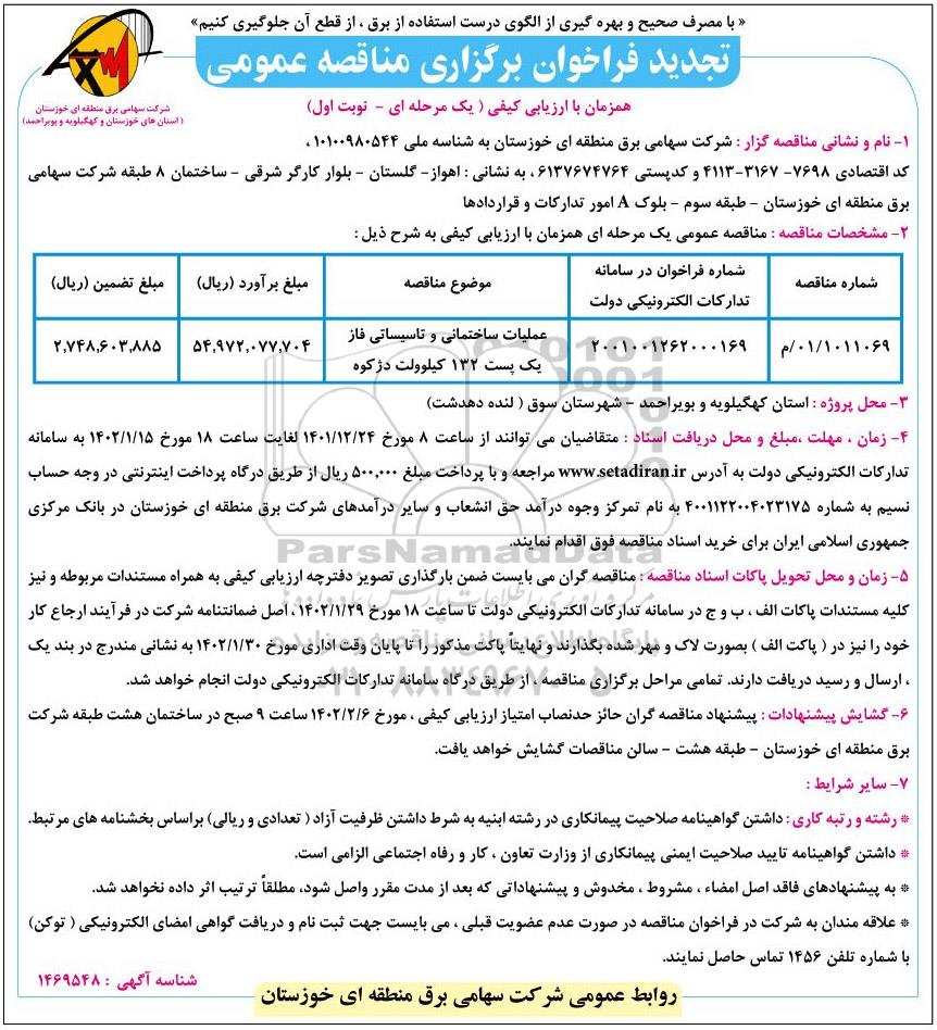 | 01/1011069/م | 2001001262000169 | عملیات ساختمانی و تاسیساتی فاز یک پست 132 کیلوولت دژکوه | 54.972.077.704 | 2.748.603.885 |