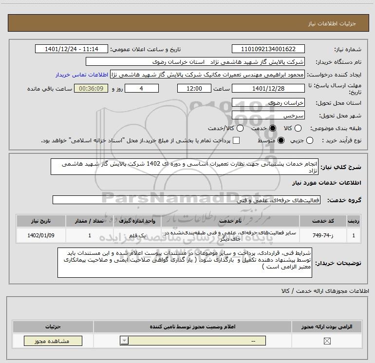 شرح کلی نیاز: انجام خدمات پشتیبانی جهت نظارت تعمیرات اساسی و دوره ای 1402 شرکت پالایش گاز شهید هاشمی نژاد