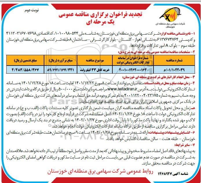 تجدید فراخوان مناقصه خرید کابل 33 کیلوولت - نوبت دوم , تجدید فراخوان مناقصه خرید کابل 33 کیلوولت - نوبت دوم