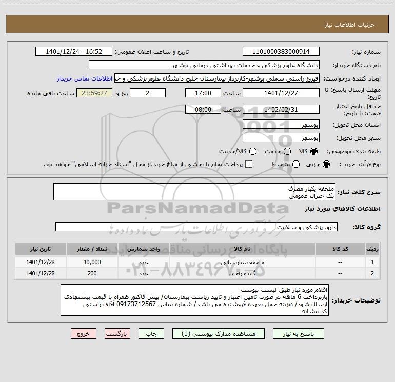 استعلام ملحفه یکبار مصرف پک جنرال عمومی, استعلام ملحفه یکبار مصرف پک جنرال عمومی