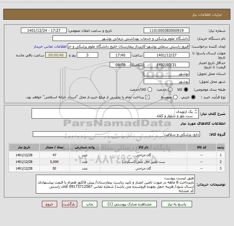 | 2 | -- | ست لباس اتاق عمل (اسکراب) | عدد | 5,000 | 1401/12/28 |