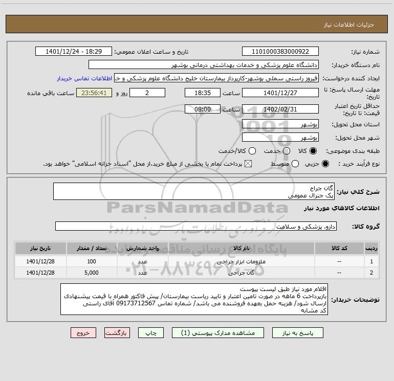 | 2 | -- | گان جراحی | عدد | 5,000 | 1401/12/28 |