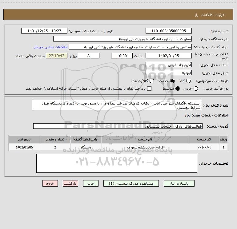 شرح کلی نیاز: استعلام واگذاری سرویس ایاب و ذهاب کارکنان معاونت غذا و دارو با مینی بوس به تعداد 2 دستگاه طبق شرایط پیوستی