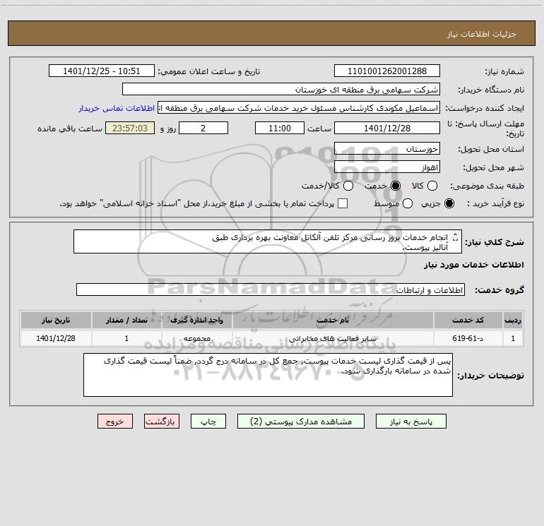 شرح کلی نیاز: انجام خدمات بروز رسانی مرکز تلفن آلکاتل معاونت بهره برداری طبق آنالیز پیوست.