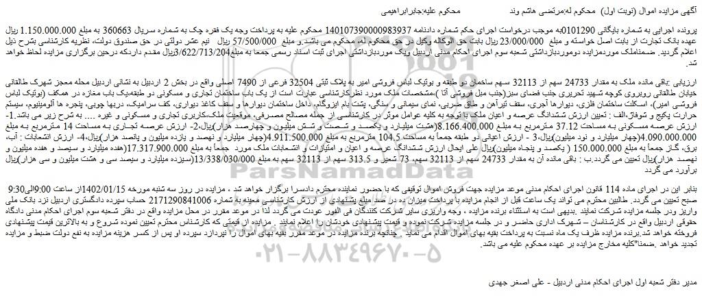 پرونده اجرایی به شماره بایگانی 0101290به موجب درخواست اجرای حکم شماره دادنامه 140107390000983937 محکوم علیه به پرداخت وجه یک فقره چک به شماره سریال 360663 به مبلغ 1.150.000.000 ریال عهده بانک تجارت از بابت اصل خواسته و مبلغ 23/000/000 ریال بابت حق الوکاله وکیل در حق محکوم له، محکوم می باشد.و مبلغ 57/500/000 ریال نیم عشر دولتی در حق صندوق دولت، نظریه کارشناسی بشرح ذیل اعلام گردید. ضمناملک موردمزایده دوموردبازداشتی شعبه سوم اجرای احکام مدنی اردبیل ویک موردبازداشتی اجرای ثبت اسناد رسمی جمعا به مبلغ3/622/713/204ریال مقدم داردکه درحین برگزاری مزایده لحاظ خواهد شد.
