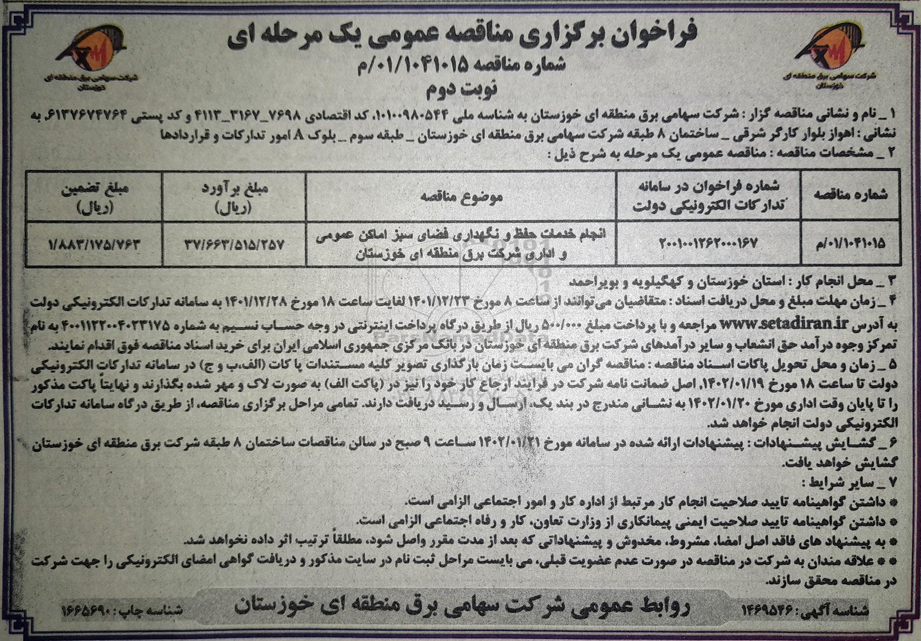 م/01/1041015 2001001262000167 انجام خدمات حفظ و  نگهداری فضای سبز اماکن عمومی و اداری شرکت برق منطقه ای خوزستان 37.663.515.257 1.883.175.763