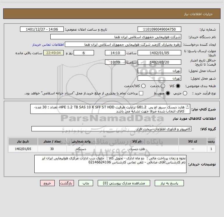 شرح کلی نیاز: هارد دیسک سرور اچ پی G81.2 ترابایت ظرفیت HPE 1.2 TB SAS 10 K SFF ST HDD- تعداد : 30 عدد- کالای انتخاب شده صرفا جهت تشابه می باشد