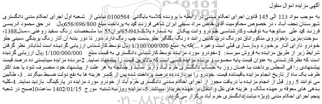 به موجب مواد 113 الی 145 قانون اجرای احکام مدنی در رابطه با پرونده کلاسه بایگانی 0100564 نیابتی از شعبه اول اجرای احکام مدنی دادگستری شهرستان نجف آباد ، در خصوص محکومیت آقای خاص مراد سیفی ایران شاهی فرزند محمد به پرداخت مبلغ 656/696/800ریال در حق محمود ادریسی فرزند محمد علی ،باتوجه به توقیف وکارشناسی خودرو وانت پیکان به شماره پلاک943د65ایران55 ،با مشخصات :رنگ سفید روغنی ،،مدل1388، سوخت:بنزین ،(خودروی مذکوراتاق دورنگ درب کابین رانند ه رنگ ،گلگیر جلو سمت چپ رنگ دارد ،دور تا دور بدنه آن آثار رنگ پریدگی ،سینی جلو خودرو دارای آثار برخورد وبازسازی قبلی است وغیره ...)که به مبلغ 1/100/000/000 ریال توسط کارشناس ارزیابی گردیده است لذابادر نظر گرفتن شرایط زیر از طریق مزایده به فروش میرسد: 1-خودرو مورد مزایده توسط کارشناس دادگستری به قیمت مبلغ 1/100/000/000 ریال ارزیابی گردیده است که نظرکارشناس به عنوان قیمت پایه محسوب و برنده مزایده کسی است که بالاترین قیمت را پیشنهاد نمایید. 2-برنده مزایده میبایستی ده درصد قیمت پیشنهادی را فی المجلس پرداخت یا همان روز به حساب دادگستری خرم آباد واریز نماید و چنانچه به هر علت از پیشنهاد خود منصرف شود یا حد اکثر ظرف یک ماه از تاریخ انجام مزایده باقیمانده قیمت خودرو را نپردازد، ده درصد پرداخت شده پس از کسر هزینه ها به نفع دولت ضبط میگردد . 3- طالبین می توانند 5 روز قبل از انجام مزایده با دریافت مجوز از اجرای احکام مدنی دادگستری خرم آباد از خودرو مورد مزایده در پارکینگ بازدید نمایند. 4-کلیه بدهی های معوقه برعهده مالک و هزینه های نقل و انتقال بر عهده خریدار میباشد. 5- مزایده روزسه شنبه مورخ 1402/01/15 ساعت10صبح در شعبه پنجم اجرای احکام مدنی (ویژه نیابت)دادگستری خرم آباد برگزار می گردد.
