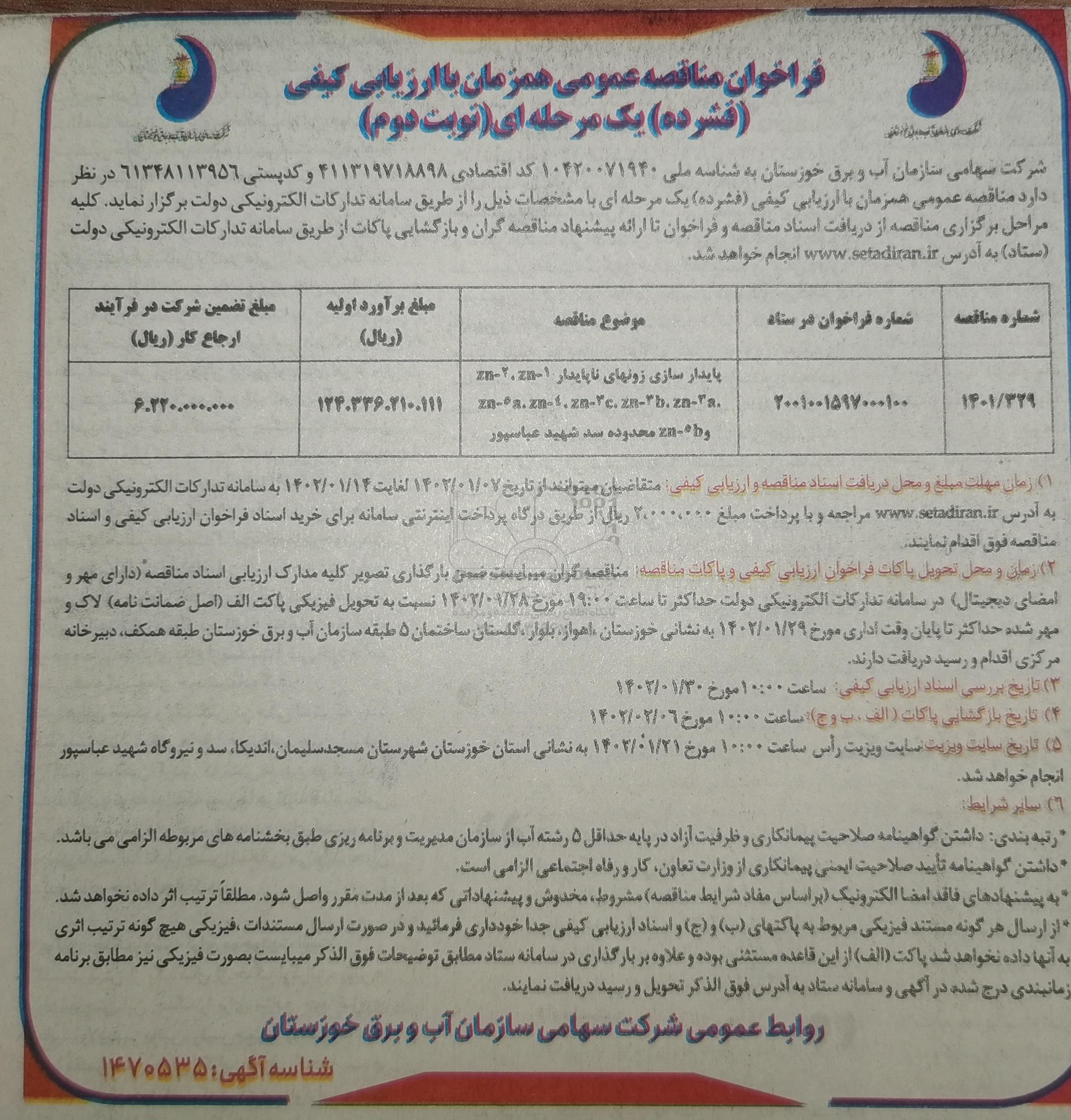 | 1401/329 | 2001001597000100 | پایدارسازی زون های ناپایدار zn-5a, zn-4, zn-3c, zn-3b, zn-3a , zn-2 , zn-1 و zn-5b محدوده سد عباسپور | 124.336.210.111 | 6.220.000.000 |
