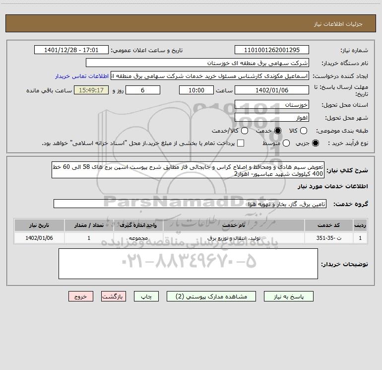 شرح کلی نیاز: تعویض سیم هادی و ومحافظ و اصلاح کراس و جابجائی فاز مطابق شرح پیوست اسپن برج های 58 الی 60 خط 400 کیلوولت شهید عباسپور- اهواز2