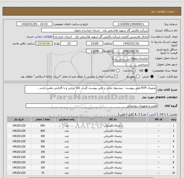 استعلام ترمینال RTP طبق پیوست - پیشنهاد مالی و فنی پیوست گردد. کالا ایرانی و با گارانتی معتبر باشد ., استعلام ترمینال RTP طبق پیوست - پیشنهاد مالی و فنی پیوست گردد. کالا ایرانی و با گارانتی معتبر باشد .