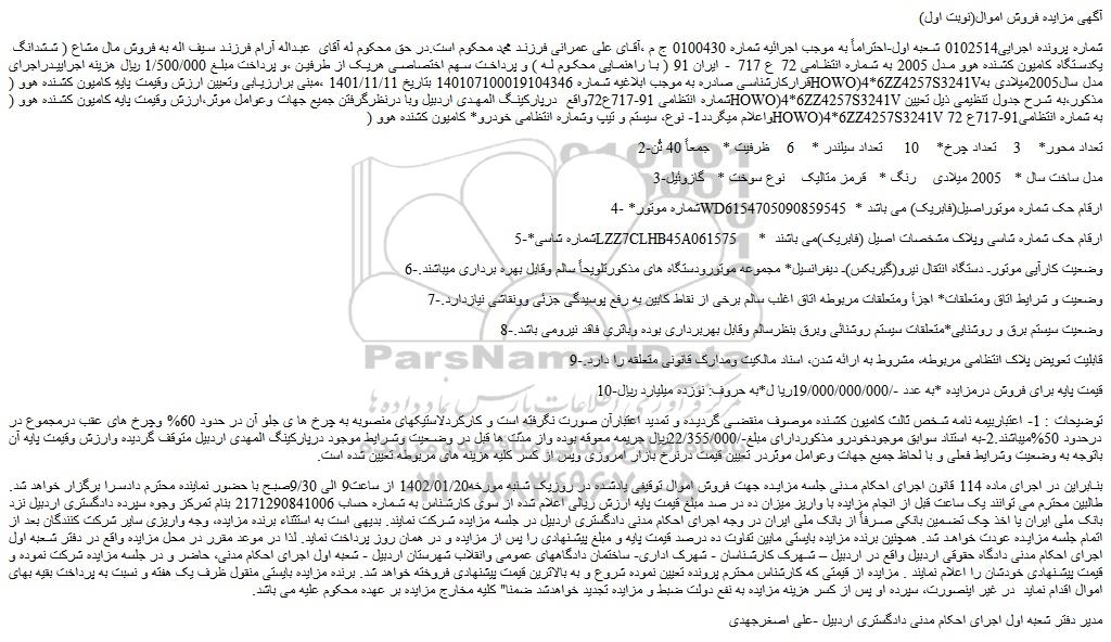 شماره پرونده اجرایی0102514 شعبه اول-احتراماً به موجب اجرائیه شماره 0100430 ج م ،آقای علی عمرانی فرزند محمد محکوم است.در حق محکوم له آقای  عبداله آرام فرزند سیف اله به فروش مال مشاع ( ششدانگ یکدستگاه کامیون کشنده هوو مدل 2005 به شماره انتظامی 72 ع 717 - ایران 91 ( با راهنمایی محکوم له ) و پرداخت سهم اختصاصی هریک از طرفین ،و پرداخت مبلغ 1/500/000 ریال هزینه اجراییدراجرای قرارکارشناسی صادره به موجب ابلاغیه شماره 140107100019104346 بتاریخ 1401/11/11 ،مبنی برارزیابی وتعیین ارزش وقیمت پایهِ کامیون کشنده هوو (HOWO)4*6ZZ4257S3241Vمدل سال2005میلادی به شماره انتظامی 91-717ع72واقع  درپارکینگ المهدی اردبیل وبا درنظرگرفتن جمیع جهات وعوامل موثر،ارزش وقیمت پایه کامیون کشنده هوو (HOWO)4*6ZZ4257S3241V مذکور،به شرح جدول تنظیمی ذیل تعیین واعلام میگردد1- نوع، سیستم و تیپ وشماره انتظامی خودرو* کامیون کشنده هوو (HOWO)4*6ZZ4257S3241V به شماره انتظامی91-717ع 72