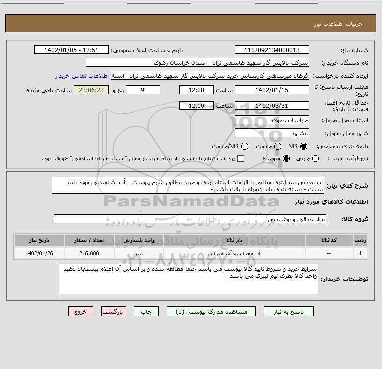 نام دستگاه خریدار:شرکت پالایش گاز شهید هاشمی نژاد استان خراسان رضوی