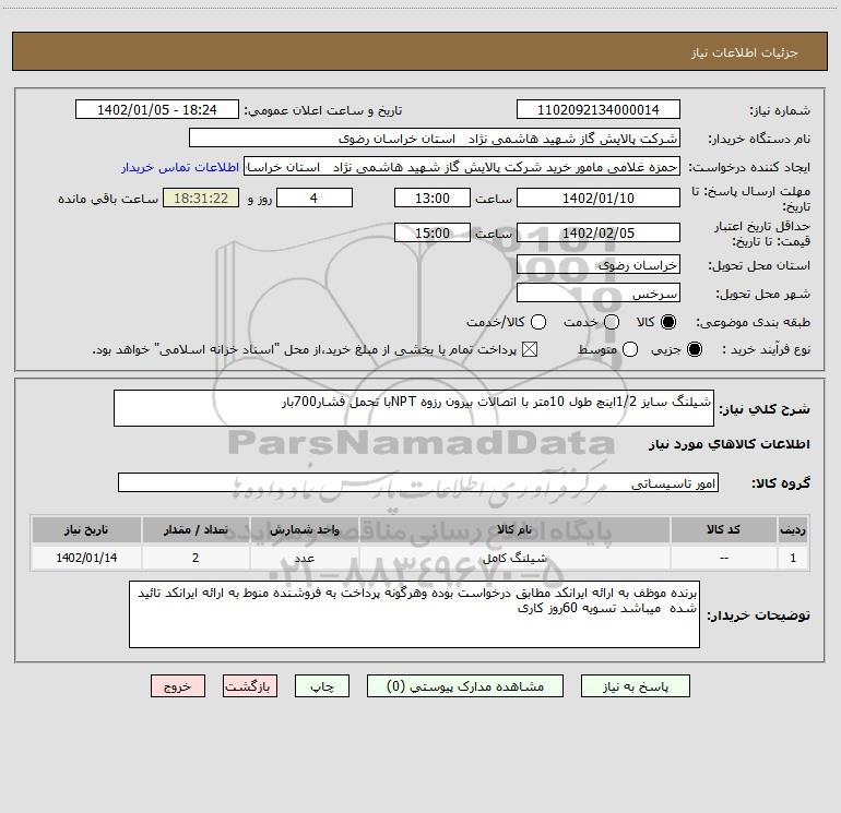 نام دستگاه خریدار:شرکت پالایش گاز شهید هاشمی نژاد استان خراسان رضوی