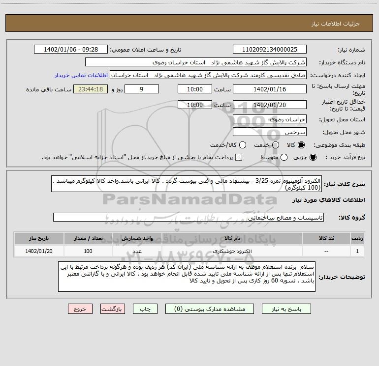شرح کلی نیاز: الکترود آلومینیوم نمره 3/25 - پیشنهاد مالی و فنی پیوست گردد . کالا ایرانی باشد.واحد کالا کیلوگرم میباشد .(100 کیلوگرم)
