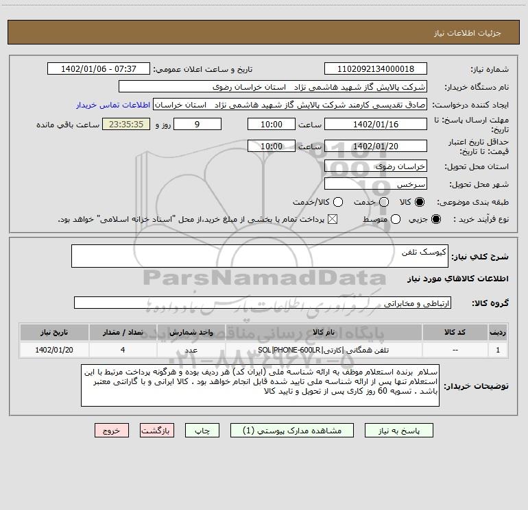 نام دستگاه خریدار:شرکت پالایش گاز شهید هاشمی نژاد استان خراسان رضوی
