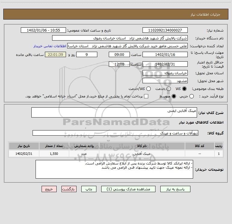 نام دستگاه خریدار:شرکت پالایش گاز شهید هاشمی نژاد استان خراسان رضوی