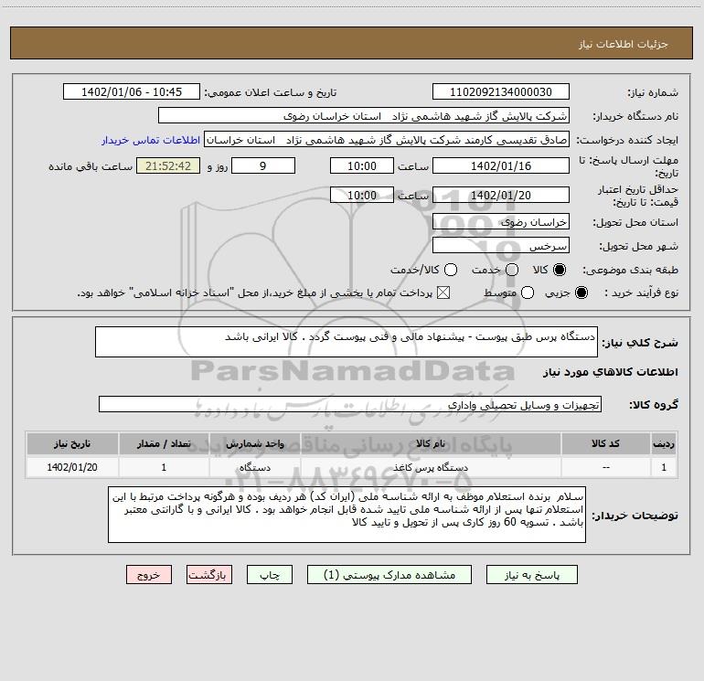 نام دستگاه خریدار:شرکت پالایش گاز شهید هاشمی نژاد استان خراسان رضوی