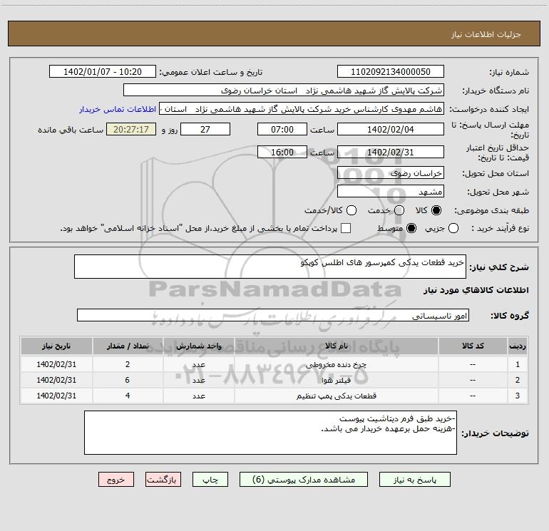 نام دستگاه خریدار:شرکت پالایش گاز شهید هاشمی نژاد استان خراسان رضوی