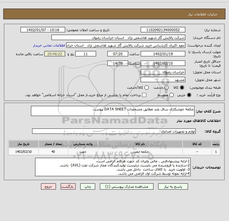 نام دستگاه خریدار:شرکت پالایش گاز شهید هاشمی نژاد استان خراسان رضوی