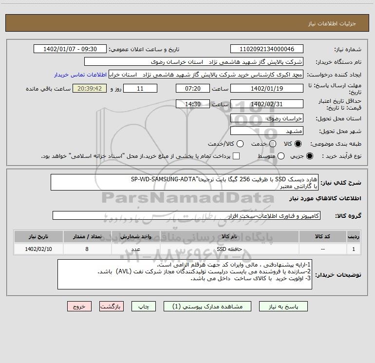 نام دستگاه خریدار:شرکت پالایش گاز شهید هاشمی نژاد استان خراسان رضوی