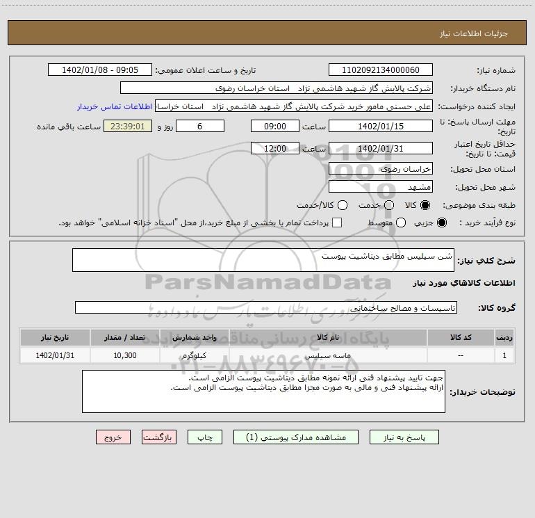 شرح کلی نیاز: شن سیلیس مطابق دیتاشیت پیوست