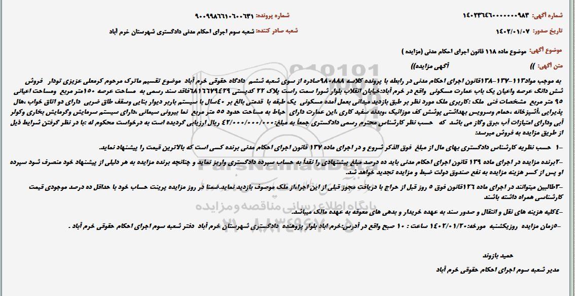 به موجب مواد113-137-138قانون اجرای احکام مدنی در رابطه با پرونده کلاسه 980888صادره از سوی شعبه ششم  دادگاه حقوقی خرم آباد  موضوع تقسیم ماترک مرحوم کرمعلی عزیزی تودار   فروش  شش دانگ عرصه واعیان یک باب عمارت مسکونی  واقع در خرم آباد:خیابان انقلاب بلوار شورا سمت راست پلاک 22 کدپستی 6816679429فاقد سند رسمی به  مساحت عرصه 150متر مربع  ومساحت اعیانی 95 متر مربع  مشخصات فنی  ملک :کاربری ملک مورد نظر بر طبق بازدید میدانی بعمل آمده مسکونی  یک طبقه با  قدمتی بالغ بر 40سال با سیستم باربر دیوار بنایی وسقف طاق ضربی  دارای دو اتاق خواب ،هال پذیرایی ،آشپزخانه ،حمام وسرویس بهداشتی پوشش کف موزائیک ،وبدنه سفید کاری ،این عمارت دارای  حیاط به مساحت حدود 55 متر مربع  نما بیرونی سیمانی ،دارای سیستم سرمایش وگرمایش بخاری وکولر آبی ودارای امتیازات آب ،برق وگاز می باشد  که   حسب نظر کارشناس محترم رسمی دادگستری جمعاً به مبلغ:42/000/000/000 ریال ارزیابی گردیده است به درخواست محکوم له :با در نظر گرفتن شرایط ذیل از طریق مزایده به فروش میرسد: