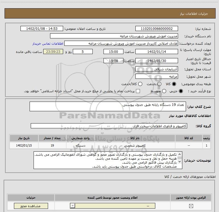 شرح کلی نیاز: تعداد 19 دستگاه رایانه طبق جدول پیوستی