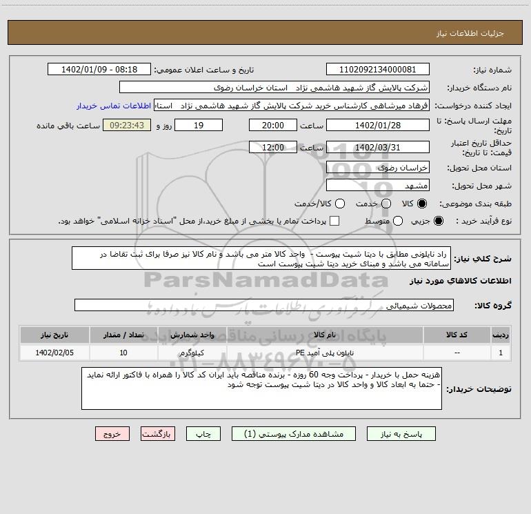 نام دستگاه خریدار:شرکت پالایش گاز شهید هاشمی نژاد استان خراسان رضوی