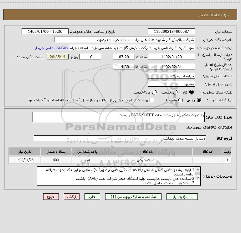 شرح کلی نیاز: پالت پلاستیکی طبق مشخصات DATA SHEET پیوست
