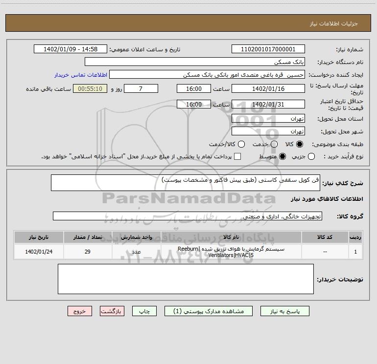 شرح کلی نیاز: فن کویل سقفی کاستی (طبق پیش فاکتور و مشخصات پیوست)