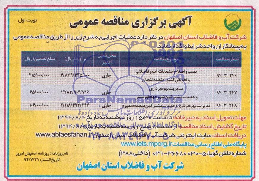 شرکت آب و فاضلاب استان اصفهان در نظر دارد عملیات اجرایی به شرح زیر را از طریق مناقصه عمومی به پیمانکاران واجد شرایط واگذار نماید.
