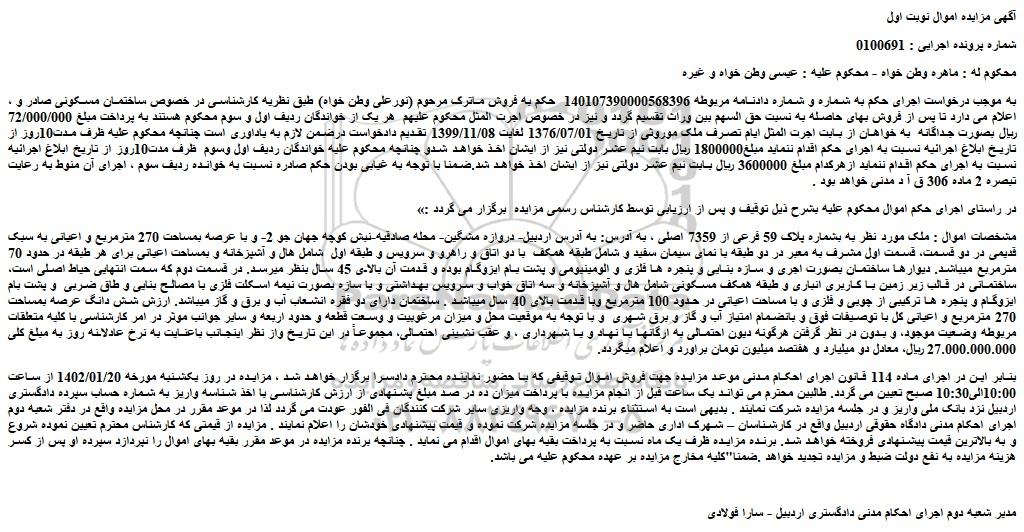 بنابر این در اجرای ماده 114 قانون اجرای احکام مدنی موعد مزایده جهت فروش اموال توقیفی که با حضور نماینده محترم دادسرا برگزار خواهد شد ، مزایده در روز یکشنبه مورخه 1402/01/20 از ساعت 10:00الی10:30 صبح تعیین می گردد. طالبین محترم می تواند یک ساعت قبل از انجام مزایده با پرداخت میزان ده در صد مبلغ پشنهادی از ارزش کارشناسی با اخذ شناسه واریز به شماره حساب سپرده دادگستری اردبیل نزد بانک ملی واریز و در جلسه مزایده شرکت نمایند . بدیهی است به استثناء برنده مزایده ، وجه واریزی سایر شرکت کنندگان فی الفور عودت می گردد لذا در موعد مقرر در محل مزایده واقع در دفتر شعبه دوم اجرای احکام مدنی دادگاه حقوقی اردبیل واقع در کارشناسان – شهرک اداری حاضر و در جلسه مزایده شرکت نموده و قیمت پیشنهادی خودشان را اعلام نمایند . مزایده از قیمتی که کارشناس محترم تعیین نموده شروع و به بالاترین قیمت پیشنهادی فروخته خواهد شد. برنده مزایده ظرف یک ماه نسبت به پرداخت بقیه بهای اموال اقدام می نماید . چنانچه برنده مزایده در موعد مقرر بقیه بهای اموال را نپردازد سپرده او پس از کسر هزینه مزایده به نفع دولت ضبط و مزایده تجدید خواهد .ضمنا"کلیه مخارج مزایده بر عهده محکوم علیه می باشد.