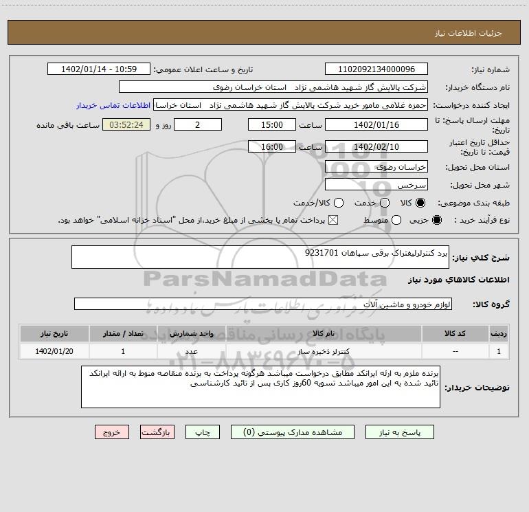 نام دستگاه خریدار:شرکت پالایش گاز شهید هاشمی نژاد استان خراسان رضوی