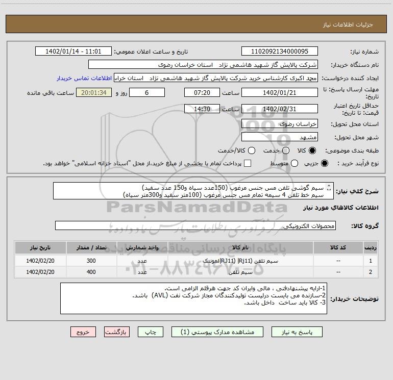 نام دستگاه خریدار:شرکت پالایش گاز شهید هاشمی نژاد استان خراسان رضوی